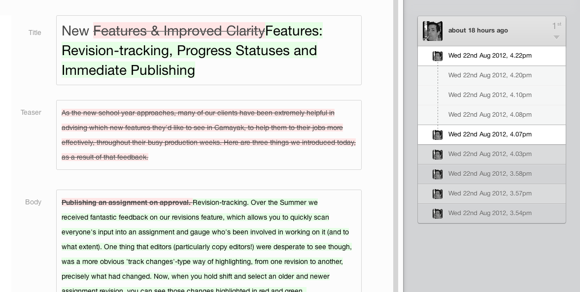 Revision-tracking. Over the Summer we received fantastic feedback on our revisions feature, which allows you to quickly scan everyone’s input into an assignment and gauge who’s been involved in working on it (and to what extent). One thing that editors (particularly copy editors!) were desperate to see though, was a more obvious ’track changes’-type way of highlighting, from one revision to another, precisely what had changed. Now, when you hold shift and select an older and newer assignment revision, you can see those changes highlighted in red and green.
